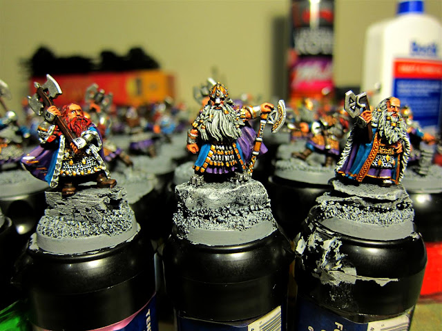 I'm pretty happy with how most of them are turning out, it's great to see them at this level of completion. Really they're way better than they need to be for just playing with, but I'm still going to do another highlight layer, wash some of the leather, touch up the beards, paint some runes on flat surfaces, eyes on those that have open eyes etc. Still, from here on it's really gravy, so it's a lot more fun to do =)