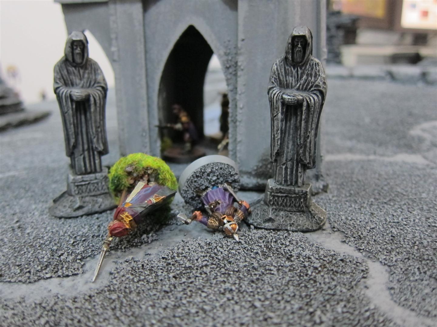 Finally, the Betrayer, sensing his time at this location was nearing completion, charged at Etako. His black miasma cloaked his attacks and those of the Watcher that darted in to stab with sharpened steel. Etako fought valiantly back, but fate was not with him and he suffered a wound. After stabbing the dwarf, the Nazgul faded away, evil laughter reverberating across the battlefield.