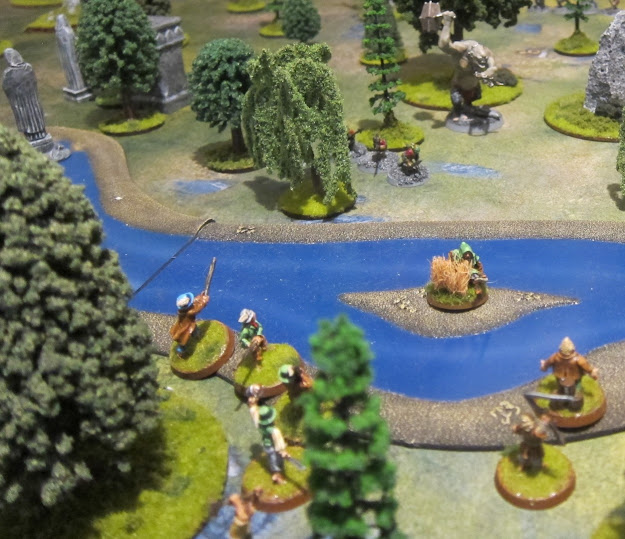 And Hedger has successfully made the leap to the little central island. The hobbits all throw stones and shoot arrows at the goblins, but fail to knock any of them out.